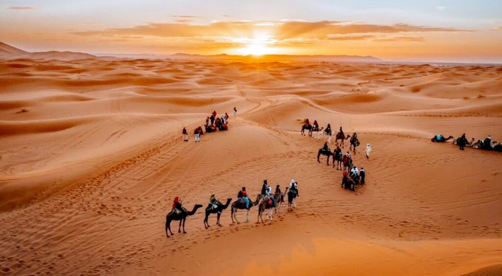 It’s a beginning of a new wonderful day. Starting 1h before the sunrise, you will ride a camel crossing the desert to catch the sunrise on the top of the big dune.