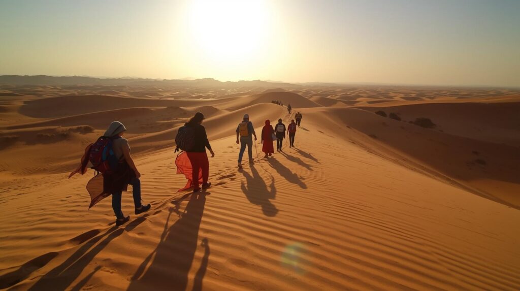 The sunset trekking experience is one of the most iconic ways to enjoy the Merzouga desert. In the late afternoon, you will set off on foot across the dunes, following ancient desert paths used by nomads for generations.